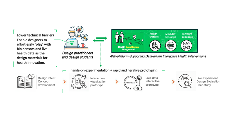 Dit project Health-Data-Design-Playground (HDDP) maakt deze visie werkelijkheid door ontwerpers in staat te stellen ruwe sensorgegevens om te zetten in boeiende, data-gestuurde dagelijkse gezondheidsinterventies door middel van praktische experimenten met gezondheidssensoren en persoonlijke gegevens.
